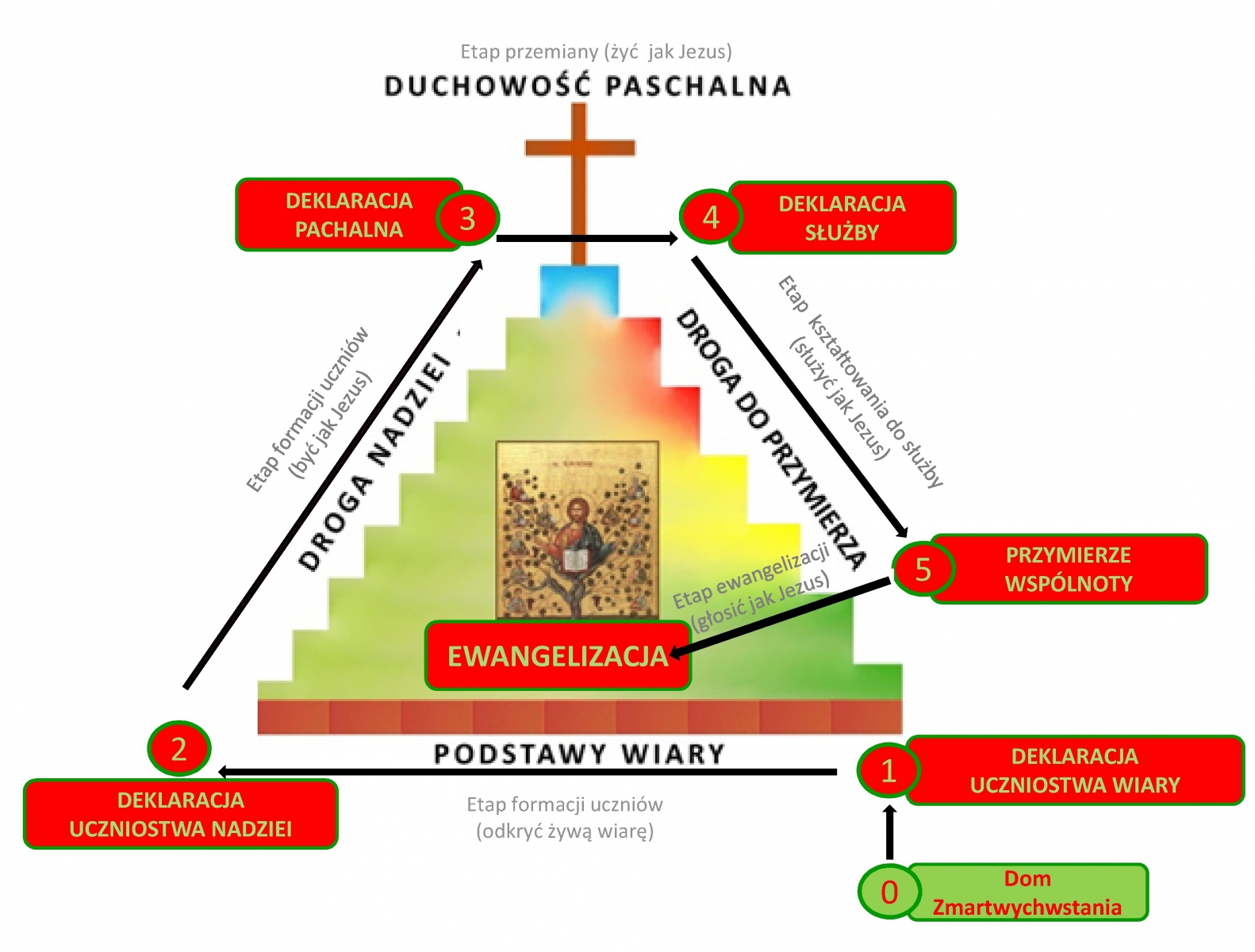 Formacja we Wspólnocie to droga wchodzenia na górę poznania Jezusa (formacji stawania się uczniem Jezusa), aby następnie będąc na szczycie doświadczyć głębokiej przemiany duchowej (zacząć żyć jak Jezus) i rozpocząć etap schodzenia do innych ludzi (ewangelizacji i służby), aby być jak Jezus i stawać się świadkami Jego Zmartwychwstania.